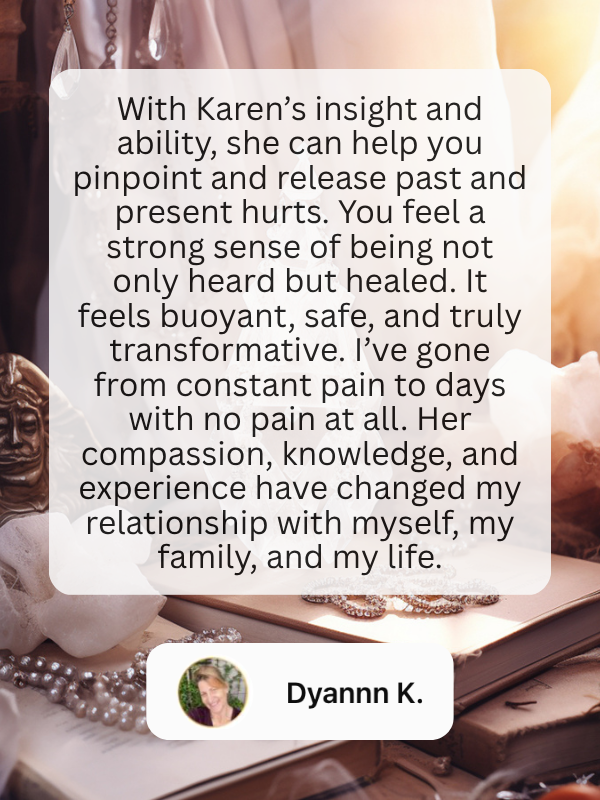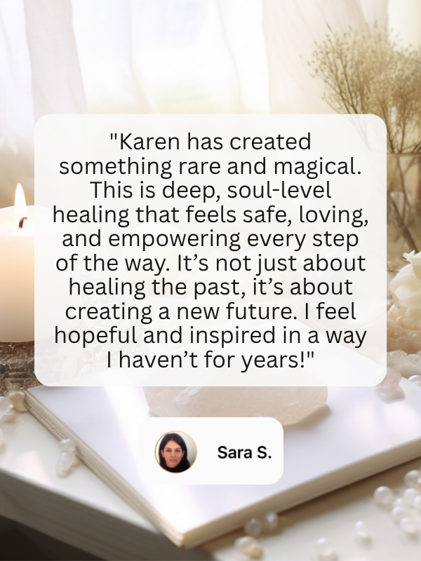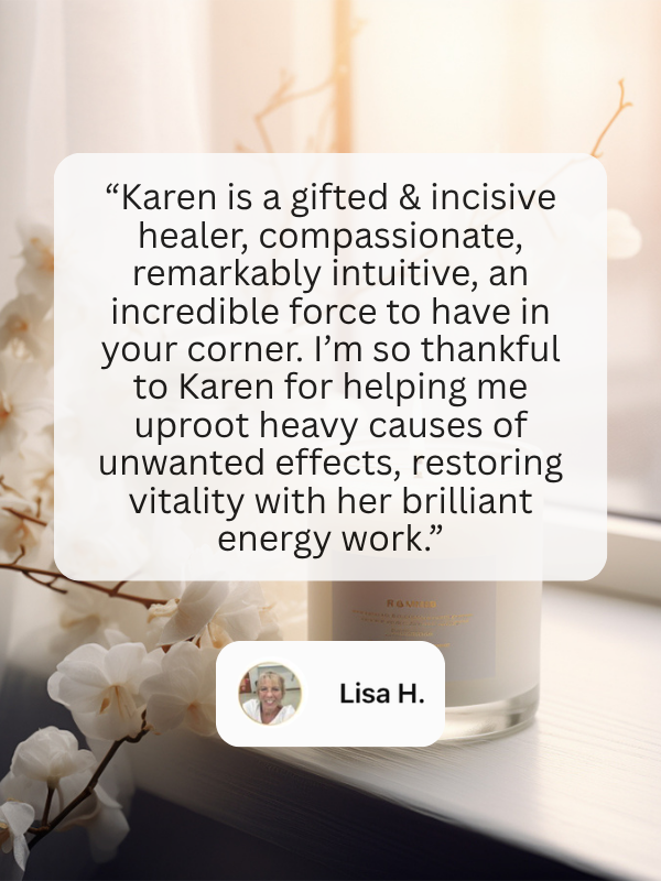 "This is not just personal growth, it’s soul-level transformation. Karen guided me in releasing energy I’ve unknowingly carried my whole life. Her uniquely intertwined talent, compassion and wisdom are so impactful and needed. The clarity, peace and reassurance I feel now are priceless. I feel more vibrant, aligned and authentic than ever!"